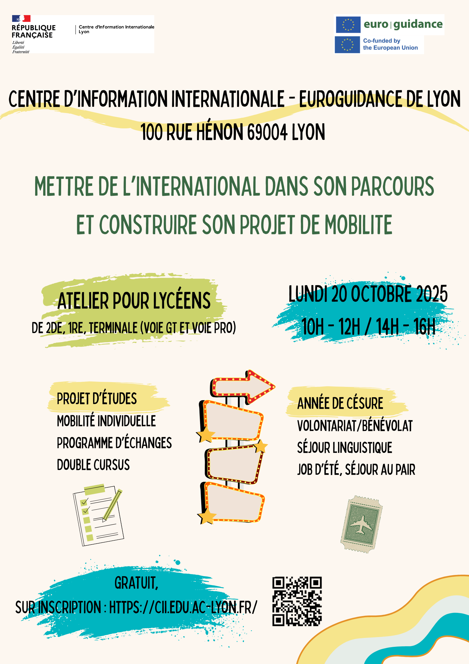 - deux ateliers en présentiel le lundi 20 octobre à 10h ou à 14h au CII-Euroguidance: INSCRIPTION OBLIGATOIRE sur https://cii.edu.ac-lyon.fr/spip/