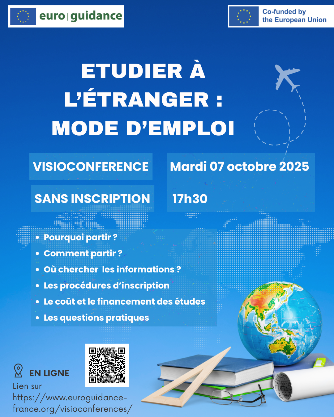 Visioconférence "Etudier à l'étranger: mode d'emploi" le mardi 7 octobre et ateliers pour lycéens le lundi 20 octobre.